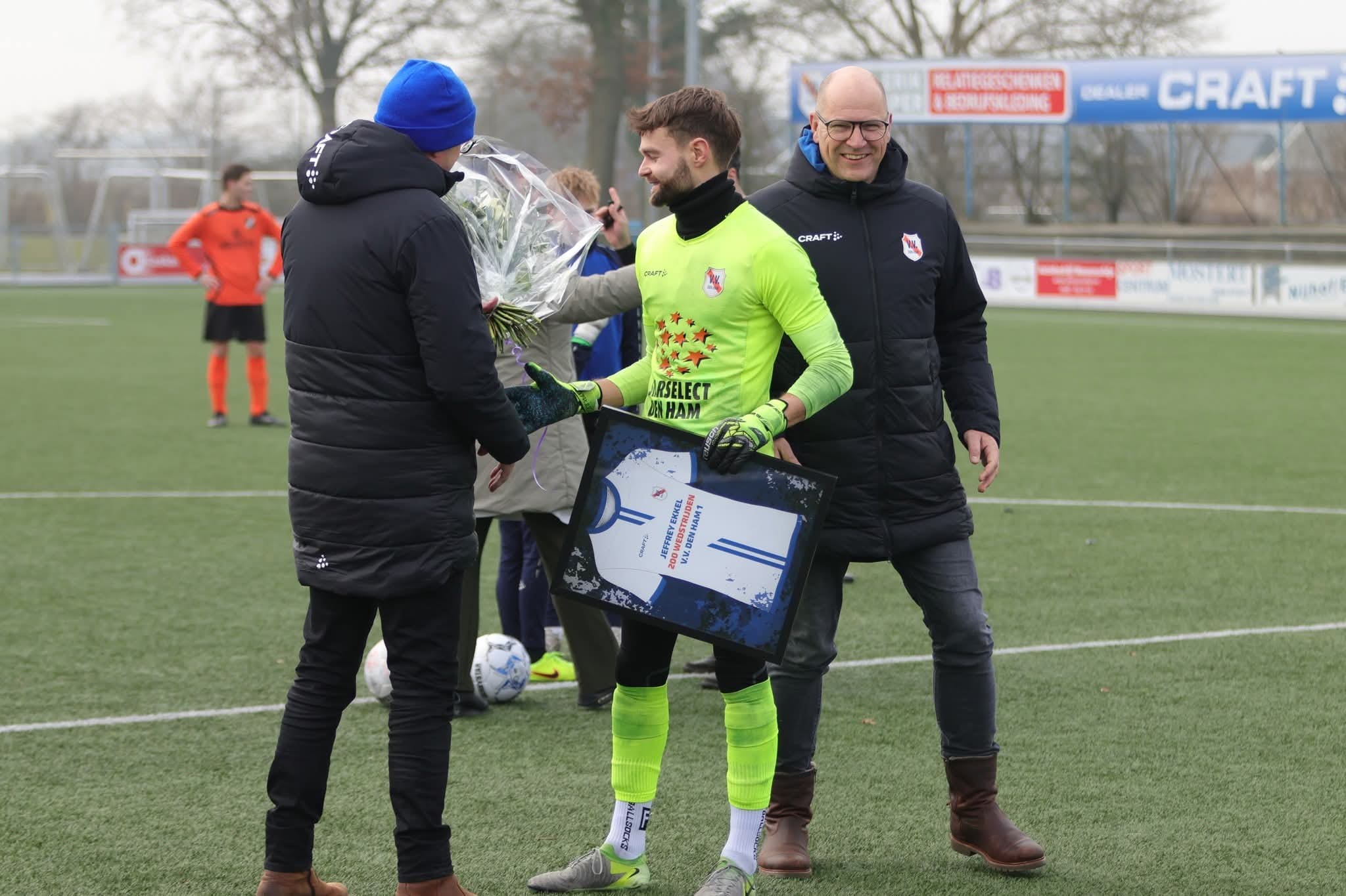 De wedstrijd Den Ham – MVV ’29 was voor Jeffrey Ekkel een heel bijzondere. Hij stond namelijk voor de 200ste keer onder de lat bij een competitiewedstrijd van Den Ham 1. Voor de match stond hij hiervoor volop in de schijnwerpers en ontving bloemen en een mooi ingelijst shirt.