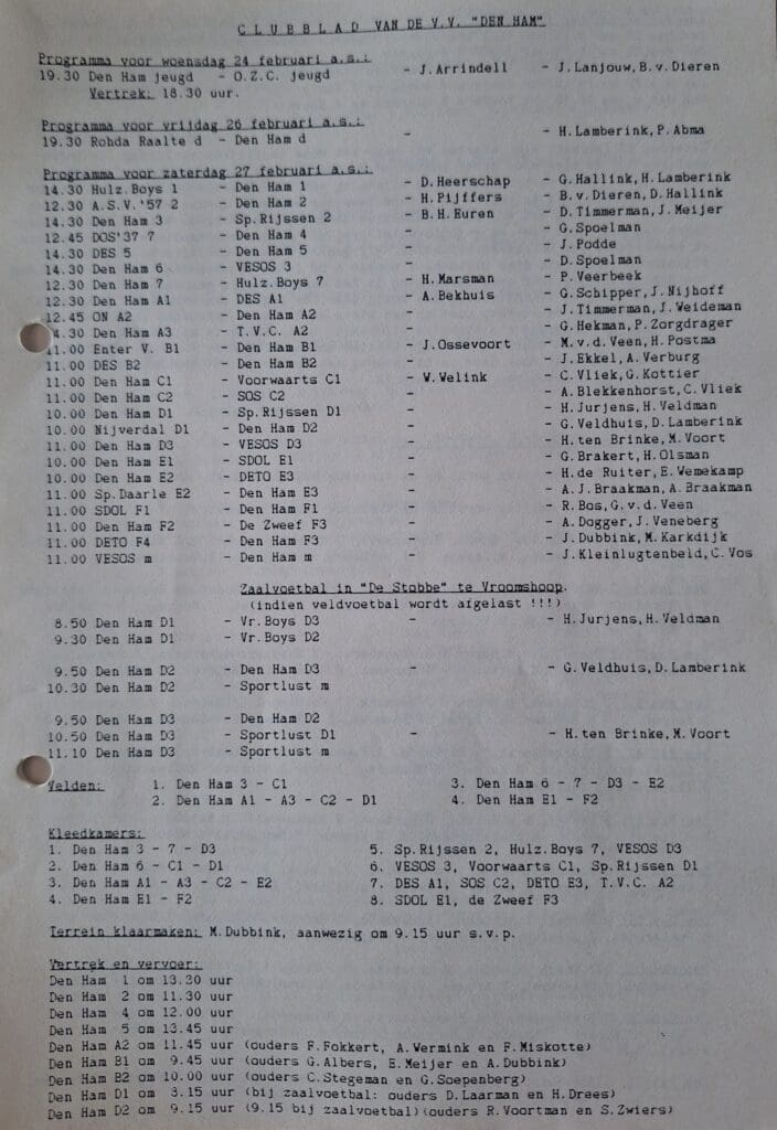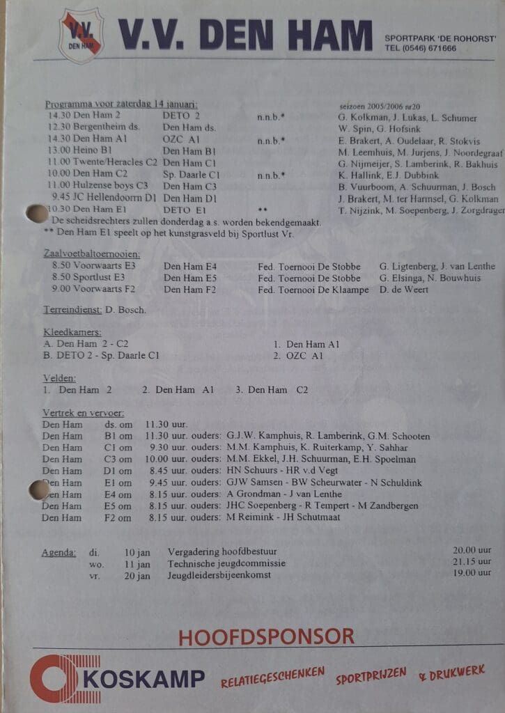 Het veel gelezen Hammer krantje was voorzien van o.a. het complete thuis- en uitprogramma, de veld- en kleedkamerindeling, de voorlopige aanstelling van de scheidsrechters, de aangewezen terreindienst, de pupil van de week, het team dat de vlaggenparade verzorgde en het vervoerschema van de jeugdteams. Al deze gegevens werden wekelijks zo zorgvuldig mogelijk in het (digitale) krantje gepubliceerd. Met de legio apps en de nieuwste versie van sportlink kunnen we voortaan nog sneller en efficiënter communiceren, zodat het voetbalkrantje van v.v. Den Ham van haar welverdiende pensioen kan genieten.
