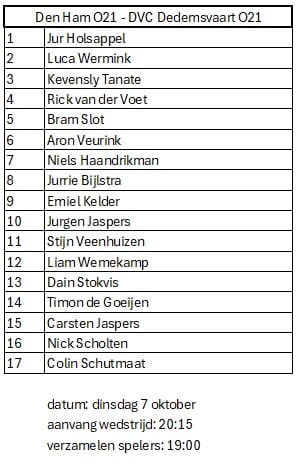 3 oktober, 2025 Aanstaande dinsdag 7 oktober speelt de volgende selectie van de O21 thuis tegen DVC Dedemsvaart: Deze wedstrijd vindt plaats op de Rohorst om 20.15 uur.