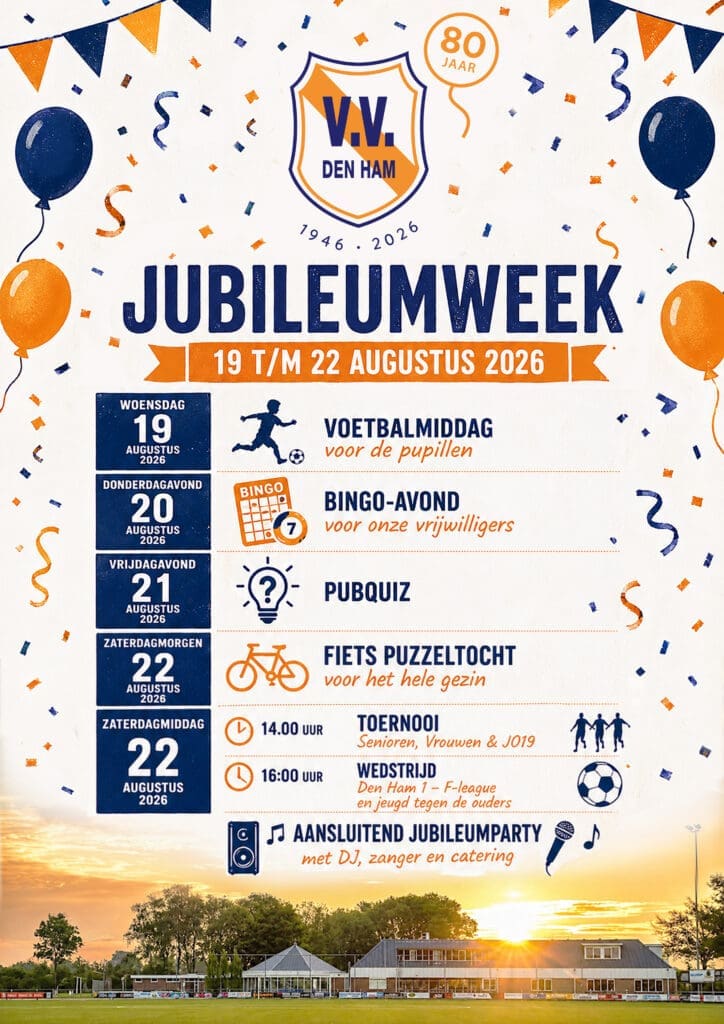 Op 1 augustus bestaan we 80 jaar, een mijlpaal die we natuurlijk niet onopgemerkt voorbij laten gaan! Daarom organiseren we een (lang) jubileumweekend van 19 t/m 22 augustus. Zet deze data alvast in je agenda: